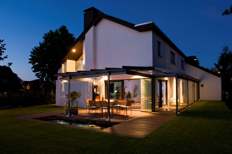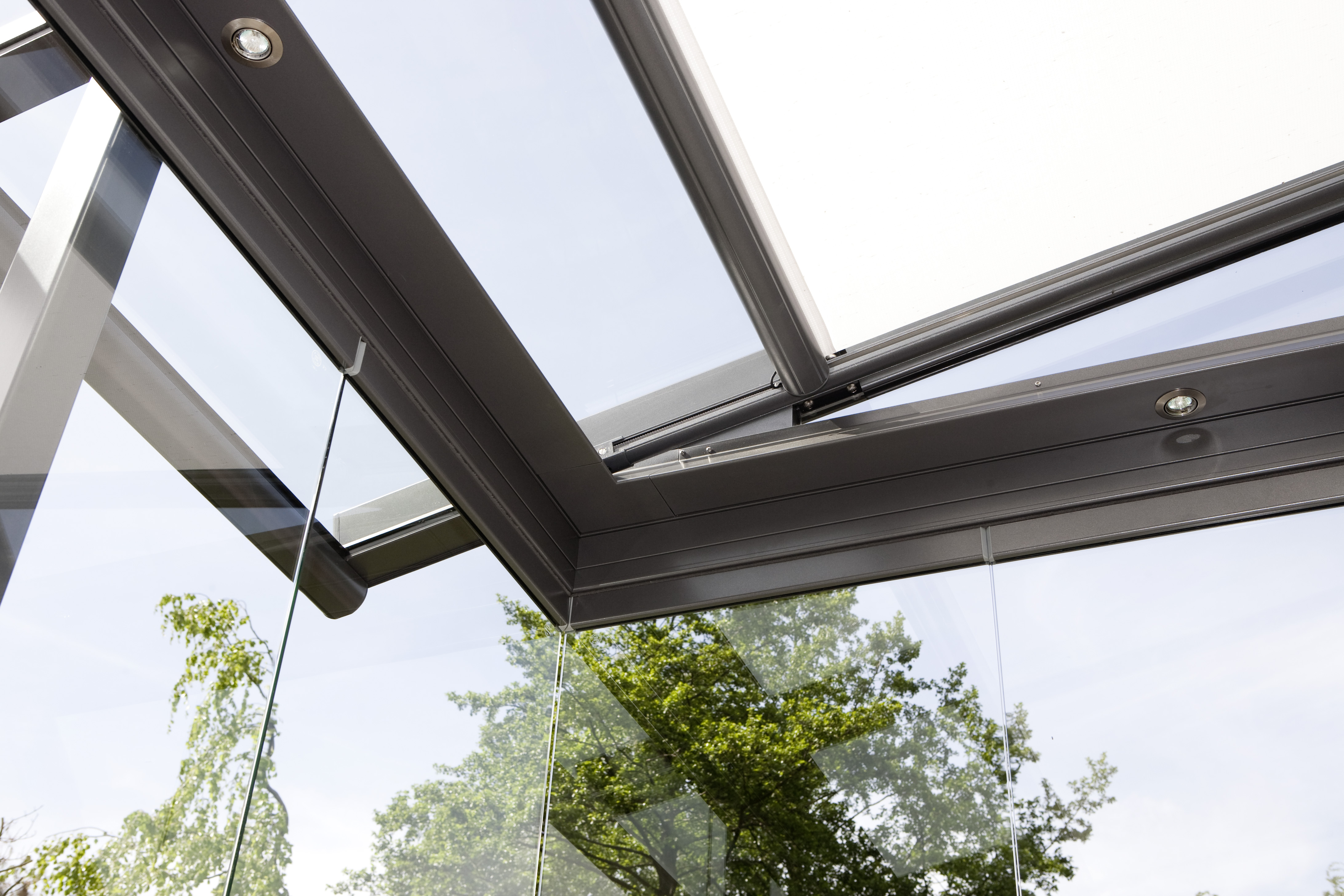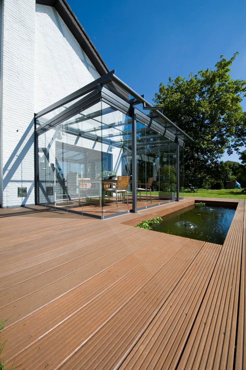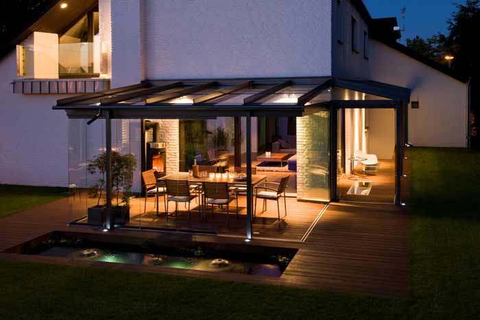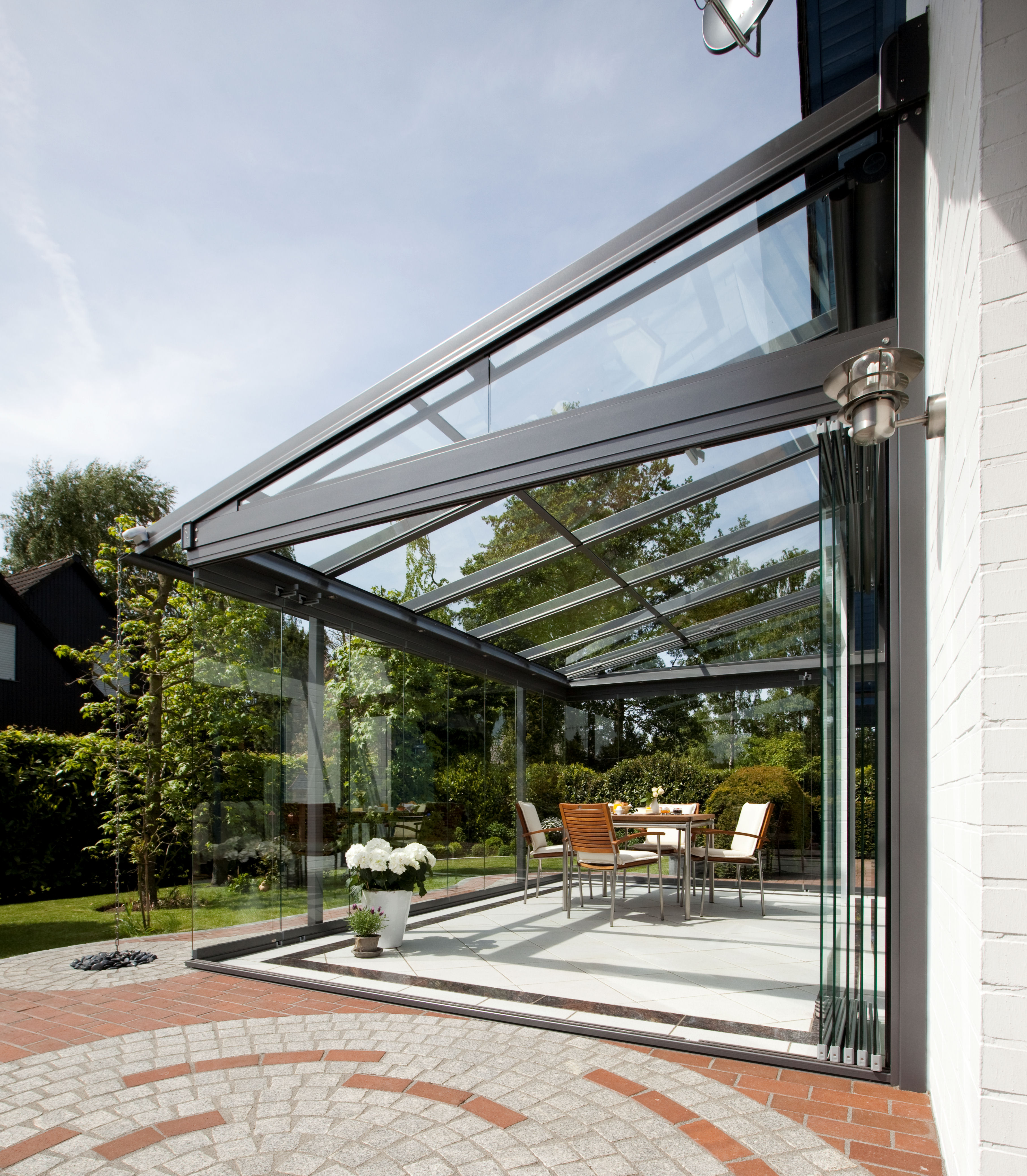 Vous pouvez coupler aisément la toiture de terrasse avec le système de vitrage de terrasse SL25 pour véranda ouverte afin de vous créer un espace lumineux mais protégé. Grâce au refoulement intégral des panneaux de vitrage de terrasse, la véranda ouverte se transforme instantanément en une terrasse couverte. Une fois les panneaux repliés, la toiture de terrasse assure toujours une protection contre les intempéries mais permet de profiter d'un espace librement exposé au grand air. Cette méthode permet confort et modularité. En associant toiture de terrasse et système de véranda coulissant vitré SL25, vous disposez d'un espace qui, refermé, sera parfaitement étanche et donc utilisable tout au long de l'année. Le débord de la toiture de terrasse confère à l'ensemble une esthétique empreinte de finesse et de légèreté. Totalement fermé l'ensemble offre une résistance supplémentaire à l'effraction. La toiture de terrasse en verre feuilletée résiste à l'enneigement et aux chocs. |